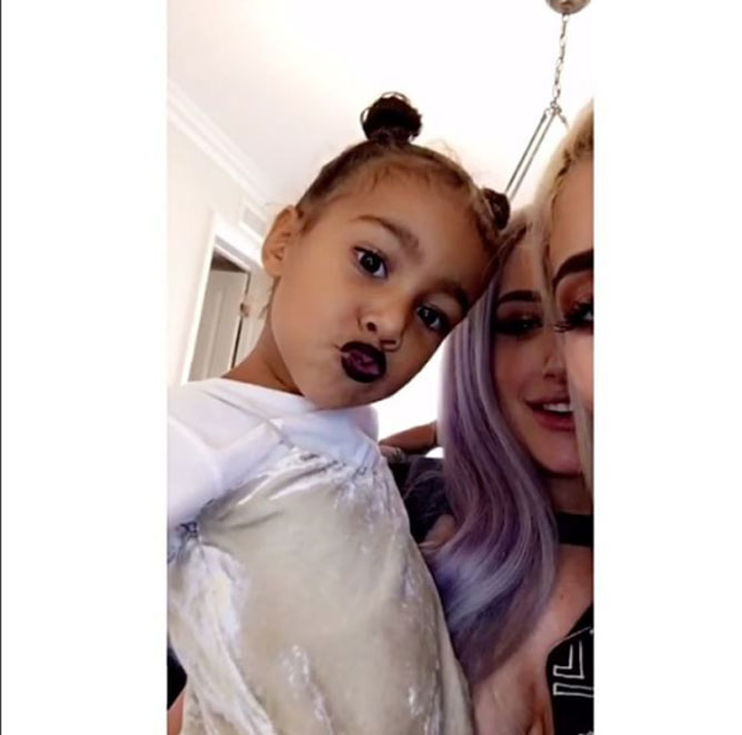 A través de Snapchat, la celebridad contó que su sobrina estaba en su casa y compartió imágenes del momento en el que utilizaba uno producto de su línea de cosméticos para pintarle de color negro los labios.